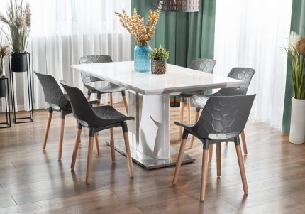 Culoare: alb, gri, negru, bleumarin Scaun: polipropilenă Picioare: lemn de plajă Înălțimea mobilierului: 77 cm Lățimea mobilierului: 45 cm Adâncimea