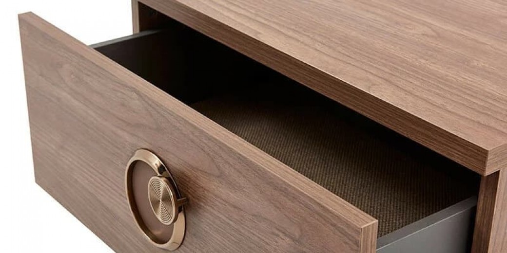 Două sertare pe ghidaje cu bile, peretele din spate din HDF. Capacul are un pahar cappuccino sau lacobel alb. Lacobel